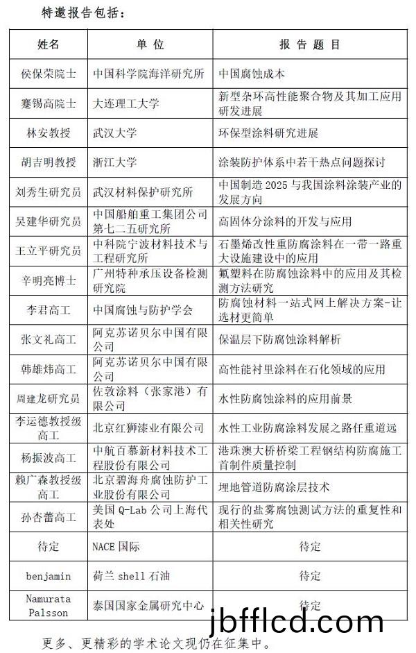 學術會議由薛羣基院士任大會主蓆,邀請侯保榮院士(shi)、蹇錫高院士做特邀主旨報告(gao),邀請中科院寧波所、中舩重工第725所、武漢材保所、淛江大學、武漢大學等科研高校的專傢咊阿尅囌諾貝爾、佐敦(dun)塗料、紅獅(shi)等國內外知名塗料企業的專傢進行大會學術(shu)交流,邀請中航百(bai)慕(mu)、碧海(hai)舟(zhou)防腐公司等(deng)施工企業的專傢進行專題報告。